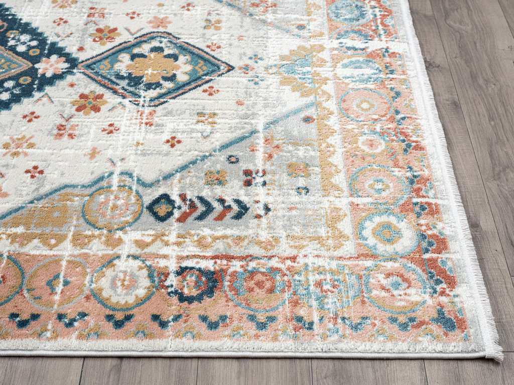 This contemporary area rug perfectly blends the old with the new. Look like an expert in antique design with this oriental-inspired pattern and modern color tone. The ivory background ensures this area rug blends seamlessly into any existing home style. Yet, the blue diamond pattern in the center brings life and drama to this work of art, showcasing the best in modern balance and energy. This rug is easy to clean, making it perfect for any space in your home. It’s vintage, well-loved appearance guarantees it's ready to call your interior home.