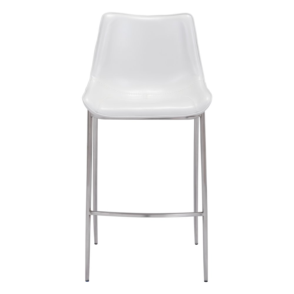 Magnus Barstool (Set of 2) White & Silver High design meets everyday casual. This handsome barstool with its slim profile pulls up perfectly to the bar. Its super comfortable curved seat is covered in white faux leather with dramatic stitching. Brushed Stainless Steel legs are complete with protective plastic feet to keep your floors scratch-free. Assembly required Plush and durable faux leather fabric Built in footrest Brushed stainless steel legs Rubber feet protect floor from scratches Support up to 280 lb | |