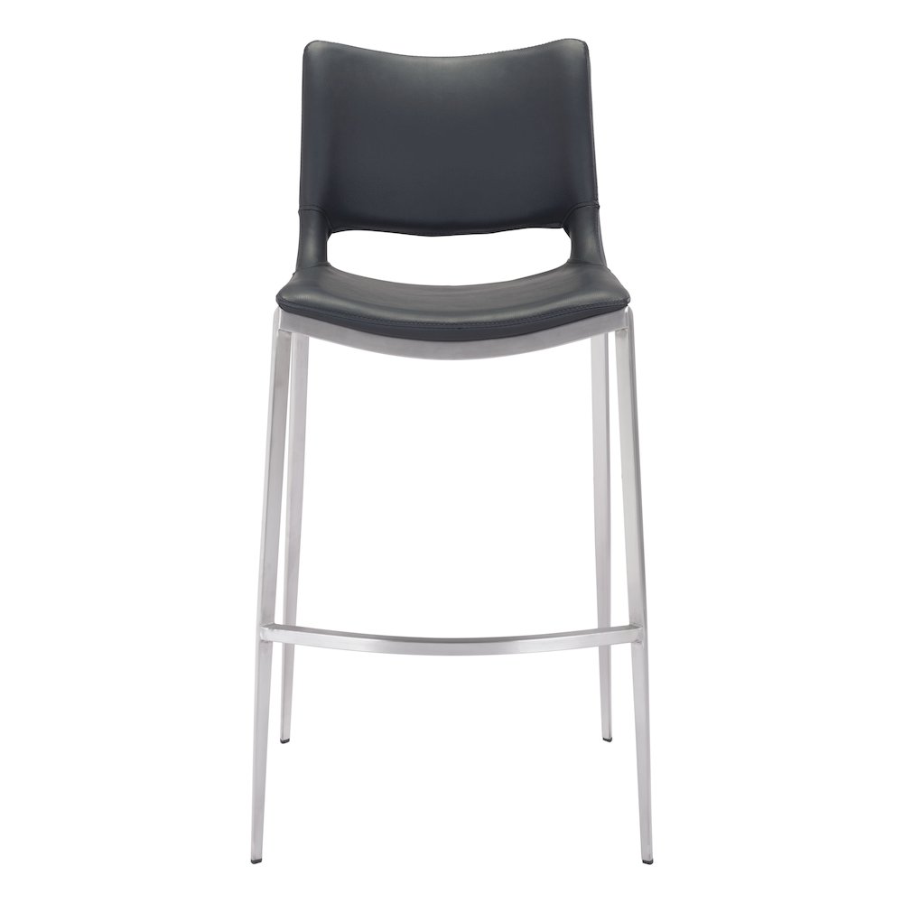 Ace Barstool (Set of 2) Black & Silver Built for comfort, this ergonomic barstool is the perfect solution for your home or office space. A brushed Stainless Steel frame plays a supporting role while the built-in curved footrest keeps you firmly planted. Black faux leather seat deck is sleek and modern, making this barstool the perfect compliment to any room setting. Assembly required Plush and durable faux leather fabric Built in footrest Brushed stainless steel legs Rubber feet protect floor from scratches Support up to 280 lb | |
