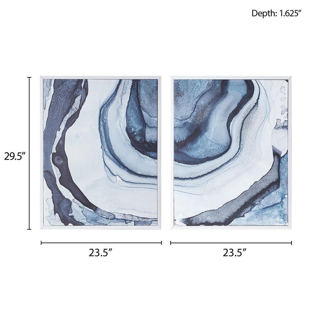 Diptych 2-piece Framed Canvas Wall Art Set Crisp and serene, the Madison Park Ethereal Diptych 2-piece Framed Canvas Wall Art Set by Artist Megan Swartz, provides a fresh and modern update to your decor. An abstract design, in light and dark shades of blue, spills across the canvas to create an icy cool contrast, while the white frame detailing adds a clean finish. A gel coat provides additional texture and a light glossy touch to this piece, while also preventing fading over time. Sold as a two piece set, each piece meausuring 23.5x29.5" and featuring 2 D-rings on the reverse, easily hang this set together for a larger focus piece or separately throughout your home for a cool touch to fit any space. With its contemporary style and frame detailing, this printed canvas wall art brings a stylish and gallery look to your living room or bedroom. Made in China Made from MDF: 60% | |