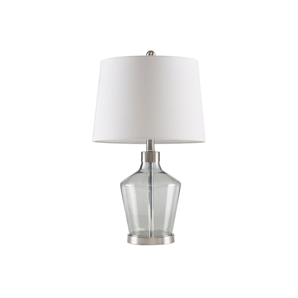 | Angular Glass Table Lamp, Set of 2 Update your living room or bedroom with the sleek style of the 510 Design Harmony Angular Glass Table Lamp, Set of 2. Beautifully designed, this glass table lamp flaunts a bold grey hue hue that adds a soft touch of color to your room. The white tapered drum-shaped lamp shade tastefully accents the base, while softly filtering the light to give off a warm glow. One Type A light bulb is needed and included. Comes with a 2-year warranty. Made in China Made from 50% Glass, 25% Fabric, 25% Iron | |