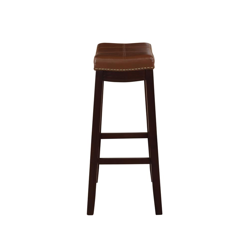 | Claridge Cognac Bar Stool This Cognac Bar Stool Will Add Stylish Seating To Any Counter Or High Top Table. The Sturdy Wood Frame Has A Dark Brown Finish Accented By A Cognac Faux Leather Seat. Antique Brass Nailhead Trim And Double Needle Accent Stitching Adds Durability To The Padded Top For An Eye-Catching Detail. 32.375" Seat Height. 275 Pound Weight Limit. Cognac Faux Leather Padded Seat Brown Wood Finish Antiqued Brass Nail Heads Seat Top Sewn With Double Needle Stitching For Durability Assembled Size: 18.75" W X 15" D X 32.5”H Seat Height 32”, Perfect For Counter Heights Of 40”- 43”H Sturdy Weight Limit 275Lbs | |