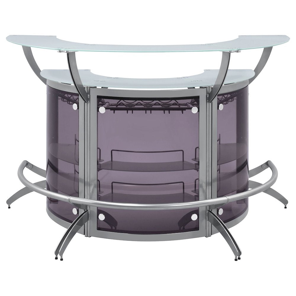 Dallas 3-piece Curved Freestanding Home Bar Cabinet Silver Perfect for the modern entertainer, this three-piece bar set adds visual intrigue and function. Constructed of metal, this bar unit set features a stunning champagne finish and smoked acrylic panels. Connect the three units together for a multi-dimensional bar experience. Display your favorite libations and stow away glassware for easy reach. The frosted tempered glass top and built-in foot rail are perfect for guests, paired with bar stools or on its own. Contemporary bar unit showcases a curved chic design with metal frame in a silver finish Smoked acrylic panels provides a high-end feel Two-tier frosted tempered glass tops with two (2) frosted tempered glass shelves Features stemware rack and three (3) bottle wine rack Features 3 units, creating the ultimate bar setup | |