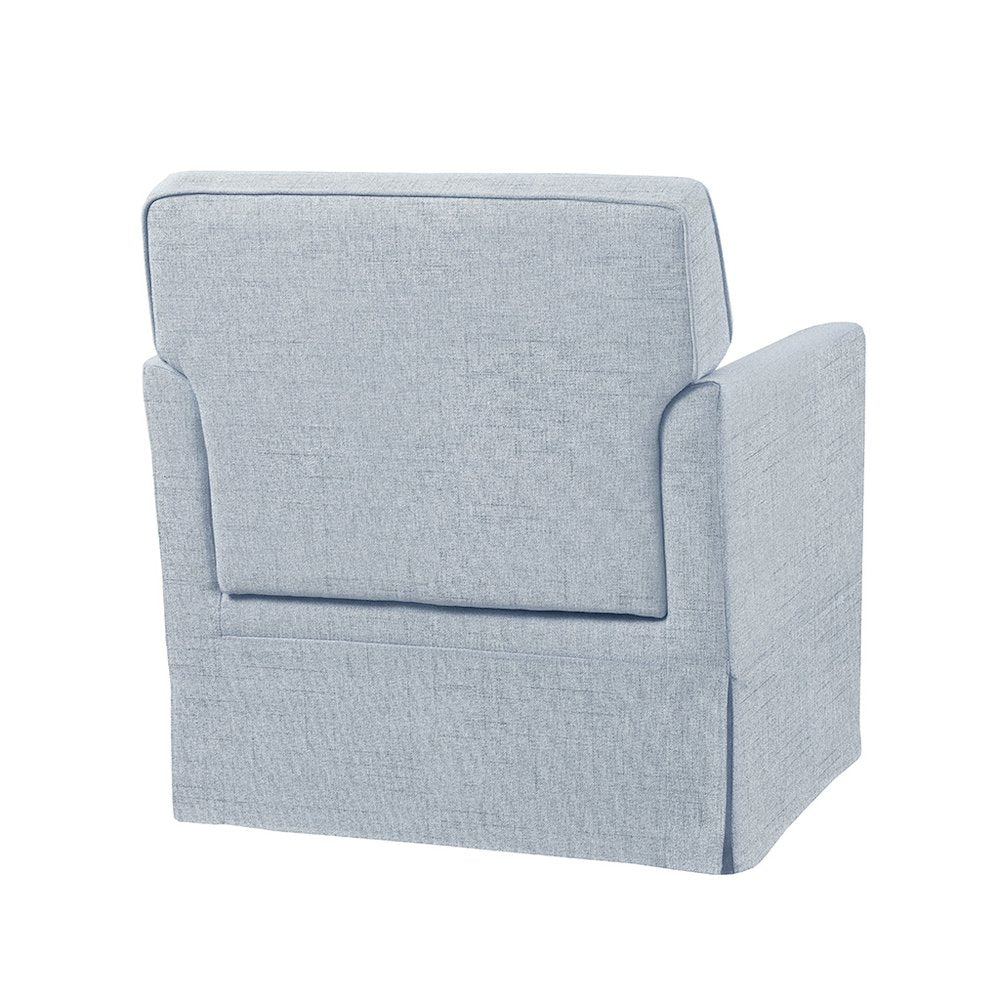 Paula Slipcover Accent Armchair, Light Blue color The accent chair takes inspiration from a timeless slipcover design, featuring a classic track arm silhouette and skirted base look. The casual and transitional style makes it a versatile addition to any living room, bedroom and guest room. Piping detail adds a structured, tailored look. The removable seat cushion ensures easy maintenance. The chair's solid wood legs and plywood frame, sinuous spring cushion support, and high-density foam provide sturdiness and durability. Assembly is tool-less for your convenience. Slipcover cannot be removed. Made of Frame: Solid wood and plywood | |