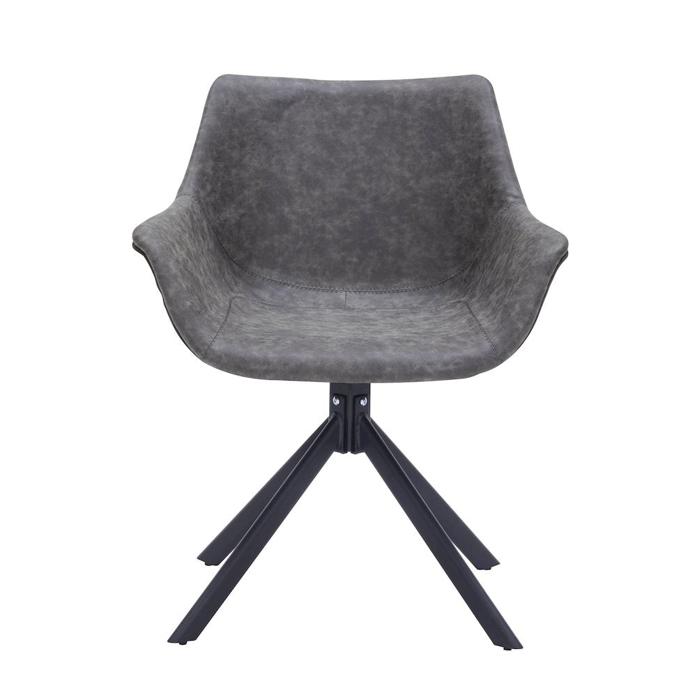 Markley Modern Leather Dining Swival Arm Chair in Grey Redefine modern elegance with the LeisureMod Markley Swivel Dining Arm Chair, crafted to deliver exceptional style, durability, and comfort. Featuring an ergonomic design with a 1.5-inch foam-filled seat and back, a waterfall edge, and seamlessly integrated armrests, it offers unmatched support for your arms, shoulders, and back. Upholstered in textured leather with a distressed pattern, the chair combines luxury with lasting durability reinforced by fine topstitching. A sturdy pyramid-style base with splayed, powder-coated iron legs ensures stability, supporting up to 250 pounds. The 360-degree swivel base enhances flexibility, perfect for dining rooms, kitchens, or home offices. Durable plastic glides protect your floors while reducing noise during movement. Easy to assemble with included hardware and instructions, this chair delivers function and flair. Add this versatile and stylish chair to your collection today and redefine your space with timeless sophistication. The dining armchair features an ergonomic design with a 1.5-inch foam-filled seat and backrest, a waterfall edge that reduces thigh pressure, and seamlessly integrated armrests and backrest for seamless support of the arms, shoulders, and back. The dining chair features durable leather upholstery with a distressed pattern that highlights its textured surface The sturdy pyramid-style base features splayed iron legs that converge at a central point, creating a balanced and stable foundation for the arm chair The powder-coated finish enhances the durability of the iron legs, protecting them from wear, scratches, and corrosion. The sleek black coating ensures long-lasting strength and adds a polished, modern appearance. The swivel base allows the chair to rotate fully in any direction, enhancing versatility and convenience The durable plastic glides protect floors from scratches and reduce noise during movement. These glides ensure smooth and easy repositioning of the kitchen chair while preserving the condition of various flooring surfaces. The assembly process includes clear assembly instructions. Each component is designed for straightforward setup, ensuring the dining chair is ready for use without complications or delays. | |