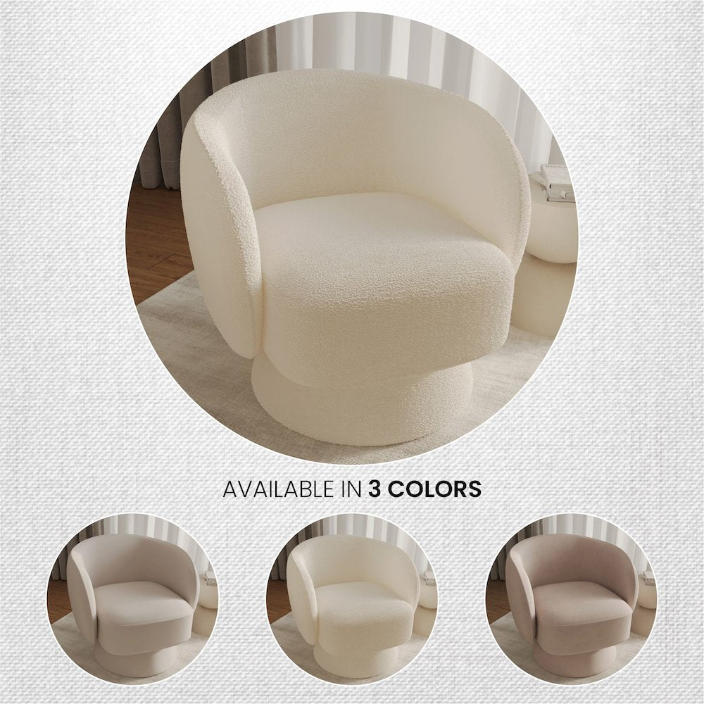 Raze Collection Modern Accent Chair in White Boucle Elevate your space with the LeisureMod Raze Accent Armchair, where modern elegance meets exceptional functionality. Its round barrel design features smooth, continuous curves that create a striking visual appeal while providing a cozy seating experience. Enjoy effortless movement with a 360-degree swivel function, allowing you to engage in conversations or reach different areas of your space with ease. Constructed from a sturdy pine wood and plywood frame, this chair supports up to 265 pounds, ensuring lasting durability. Choose between luxurious boucle, plush velvet, or smooth linen upholstery, both enhanced with high-density foam padding for an ultimate comfort. The removable round base simplifies transport and storage, while protective glides prevent scratches on your floors. The accent chair showcases a rounded, barrel-shaped design with smooth, continuous curves and a symmetrical shape The chair features a 360-degree swivel mechanism, allowing it to rotate smoothly in all directions The chair is constructed with a pine wood base and a plywood inner support The chair is available in three upholstery options: boucle, velvet, and linen, each with detailed topstitching The armchair's seat and backrest are padded with high-density foam, featuring a seat cushion thickness of 7.87 inches and a backrest thickness of 3.94 inches The modern accent chair is supported by a round base that provides a stable and balanced foundation. The base is designed to be removable, allowing for easier transportation and storage, as well as convenient adjustments to the chair’s setup. Equipped with plastic glides on each leg, the chair prevents damage to floors by minimizing scratches and scuffs. These glides facilitate smooth and quiet movement across different types of flooring, including hardwood, tile, and carpet. | |