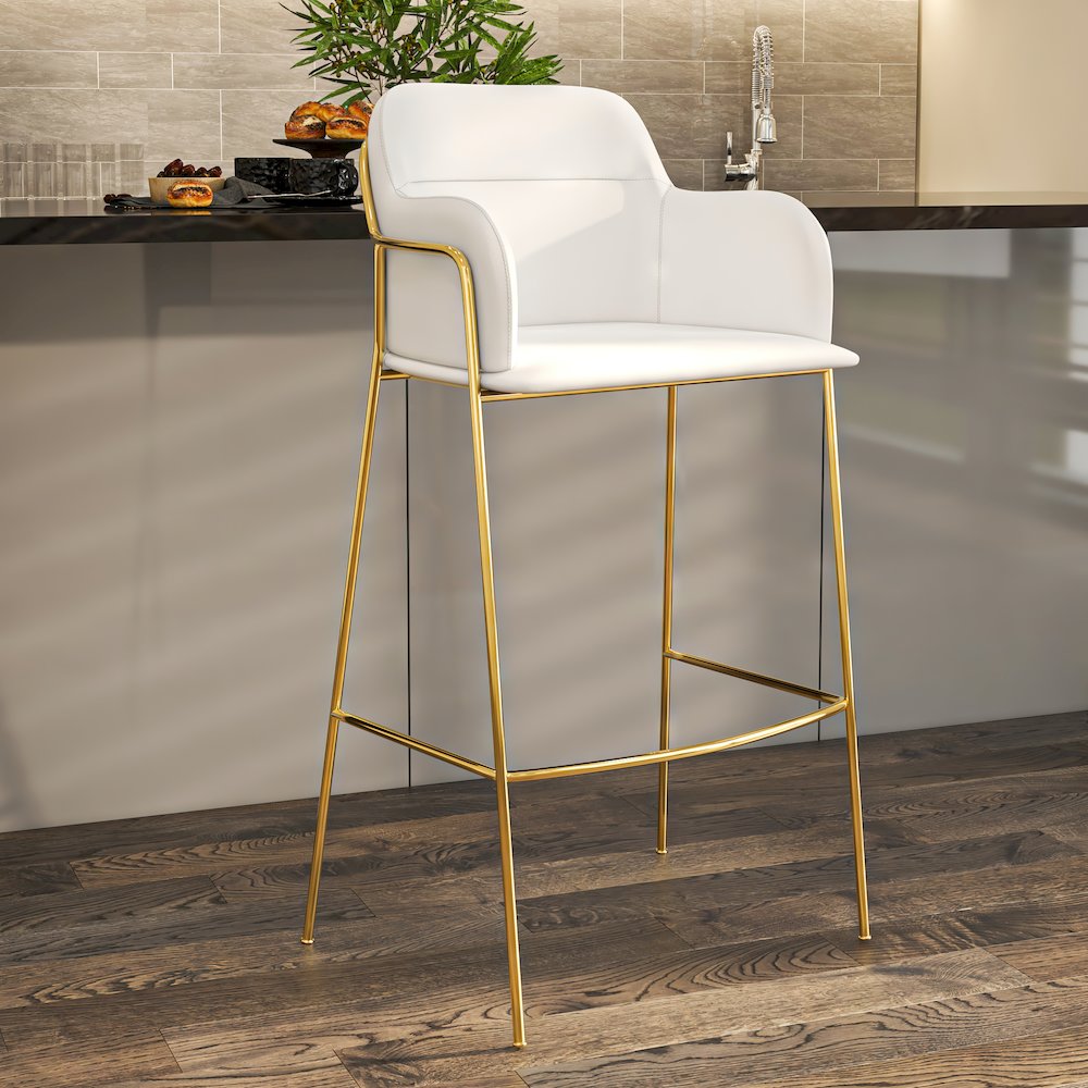 | Axis Collection Modern Gold Bar height Chair in White Enhance your home with the Axis Bar Stool, expertly crafted to combine style, comfort, and durability. The stool features an upholstery made from high-quality polyester, leather, or velvet, offering a sophisticated look that’s easy to maintain. The stainless-steel base is polished for a sleek finish and enhanced durability. Designed with ergonomics in mind, the stool comes with a low backrest and armrests, providing superior comfort for extended seating. The stool is filled with plush foam, offering a comfortable and supportive seating experience and the integrated footrest adds an extra layer of relaxation. Whether you're entertaining guests or enjoying a quiet moment, this bar stool is a stylish and practical addition to any home. The barstool’s backrest is designed to provide optimal support for your lower back, helping to maintain a healthy posture when seated. The armrests are positioned to support your arms, reducing strain and enhancing overall comfort. Built with a stainless steel and polished finish, this pub chair features 0,05-inch thick tubular frame for durability and stability The bar chair features upholstery available in either velvet, leather, or polyester, offering softness and durability for daily use. It is designed with precise single topstitching that adds a refined look while maintaining strong and reliable seams. The counter-height stool is equipped with high-density foam (1.5 lbs./cu. ft.) padding in the seat and back. The foam provides a firm and comfortable seating experience, contouring to your body to alleviate pressure points. The built-in footrest provides a convenient place to rest your feet, enhancing the comfort of your seating experience. The counter stool is equipped with plastic floor glides to protect your floors from scratches. With its clean and modern aesthetic, this barstool fits into various decor styles. Whether you're furnishing an industrial loft, contemporary kitchen, home bar, or commercial space, this versatile piece enhances any setting. This barstool requires no assembly and is easy to care for- just spot clean with a dry or damp cloth to keep it looking fresh. | |