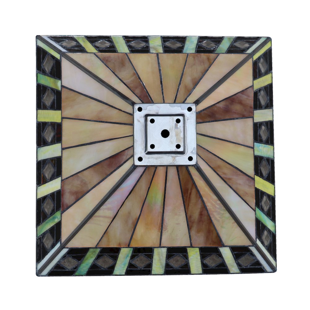 | Giles Tiffany-Style 3-Light Mission Double Lit Table Lamp 16" Shade Giles is a stunning 3 light double lit table lamp, featuring a beautiful mission shade. This piece would be perfect by a bed or in a foyer. Each shade is hand-crafted, using the same methods developed by Louis Comfort Tiffany in the early 1900's. This process entails using 196 hand cut stained art glass pieces and 24 glass beads, each wrapped in fine copper foil and soldered together at extremely high temperatures to form each unique piece. Exact size to the nearest inch may vary, and exact color of each glass piece may vary due to each piece being hand crafted. First image is with the light shining through, second image is with no light. Dry listed and recommended for an indoor setting. (2) 60 Watt max E26 Type A + (1) 15w E12 Type C Bulbs (not included) Pull chain switch, On-cord rotary switch 196pcs glass cut, 24 glass beads Square | |