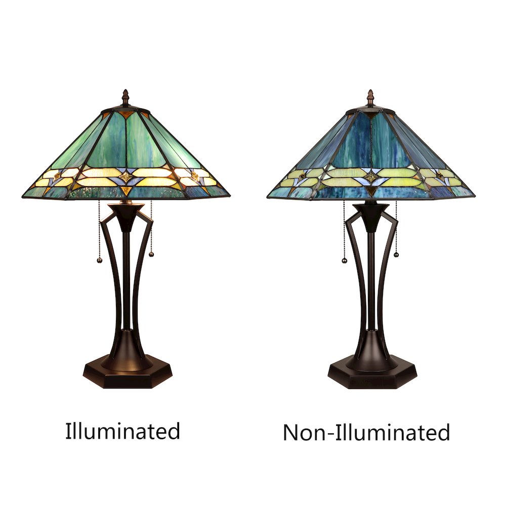 | Hyland Geometric Style 2-Light Table Lamp 18" Shade Hyland is a stunning 2 light table lamp, featuring a beautiful geometric shade. This piece would be perfect by a bed or in a foyer. Each shade is hand-crafted, using the same methods developed by Louis Comfort Tiffany in the early 1900's. This process entails using 120 hand cut stained art glass pieces and 6 glass beads, each wrapped in fine copper foil and soldered together at extremely high temperatures to form each unique piece. Exact size to the nearest inch may vary, and exact color of each glass piece may vary due to each piece being hand crafted. First image is with the light shining through, second image is with no light. Dry listed and recommended for an indoor setting. (2) 100 Watt max E26 Type A Bulbs (not included) Pull chain switch 120pcs glass cut, 6 glass beads Round | |