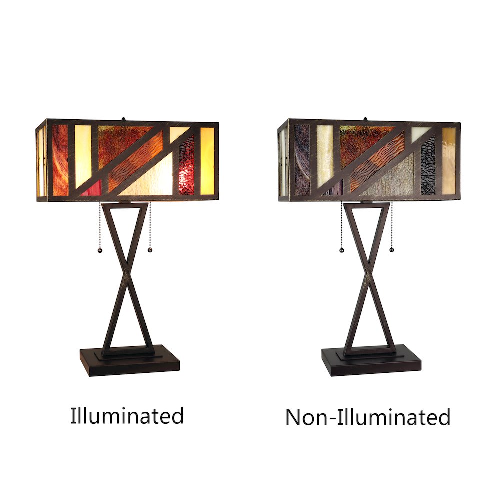 | Retro-Style Stained Glass 2-Light Table Lamp 16" Shade New to the Chloe spotlight is the beautiful Retro-Style line! These lamps are made up of stained glass pieces that are carefully inserted into metal frames, no soldering! This lamp is made up of 24 pieces of hand-cut art glass and features a unique base design, sure to compliment your modern home decor. The exact color of each glass piece may vary due to each piece being hand crafted. First image is with the light shining through, second image is with no light. Dry listed and recommended for an indoor setting. (2) 60 Watt max E26 Type A Bulbs (not included) Pull chain switch 24pcs glass cut Rectangular | |