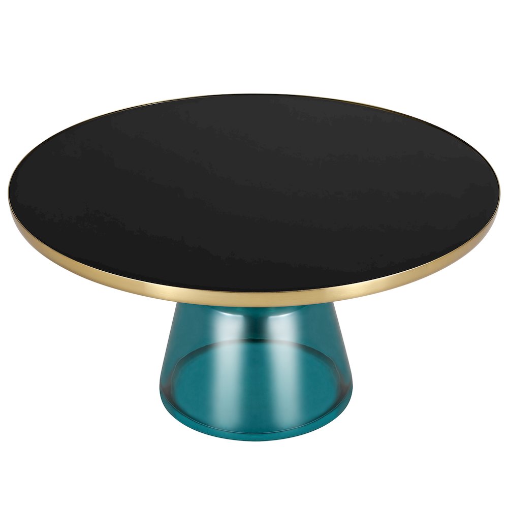 Tully Collection Glass Coffee Table Blue glass, Gold Rim with Black Glass top Meet the LeisureMod Tully Coffee Table, the stylish showstopper your space has been waiting for. With its perfectly round top and tapered conical base, this table is all about modern vibes and effortless charm. Choose between a glossy black tinted glass top or a textured sintered stone option—both framed by a brushed gold rim for that extra pop of sophistication. Compact yet sturdy, it’s ready to handle whatever you throw at it, up to 165 pounds. Delivered fully assembled, it’s a hassle-free way to add a bold statement to any room. Let Tully do the talking while you enjoy the compliments. A perfectly round tabletop with smooth edges sits on a gently tapered conical base that narrows at the top and widens at the bottom. The balanced shape and artistic design create a visually striking and modern centerpiece. Available in two top options: black tinted glass and sintered stone. The glass features a scratch-resistant, glossy finish, while the stone offers a durable, textured appearance. Framed with a brushed gold rim, the tabletop features a strong and durable edge made from iron. The sturdy construction resists wear, adds stability, and enhances the table's refined design with its elegant metallic finish. Built to hold up to 165 pounds, the coffee table features a strong glass base and sturdy construction made with durable materials, ensuring reliable support and stability for everyday use. Measuring 14.56 inches in height and 30 inches in both width and depth, the table fits seamlessly into living rooms, lounges, offices, or compact areas while offering a spacious surface for decor, books, or beverages. Requires only a quick wipe with a dry or damp cloth to maintain its pristine look Arrives fully assembled for instant use, eliminating the need for tools or setup and making it a hassle-free addition to your space. | |